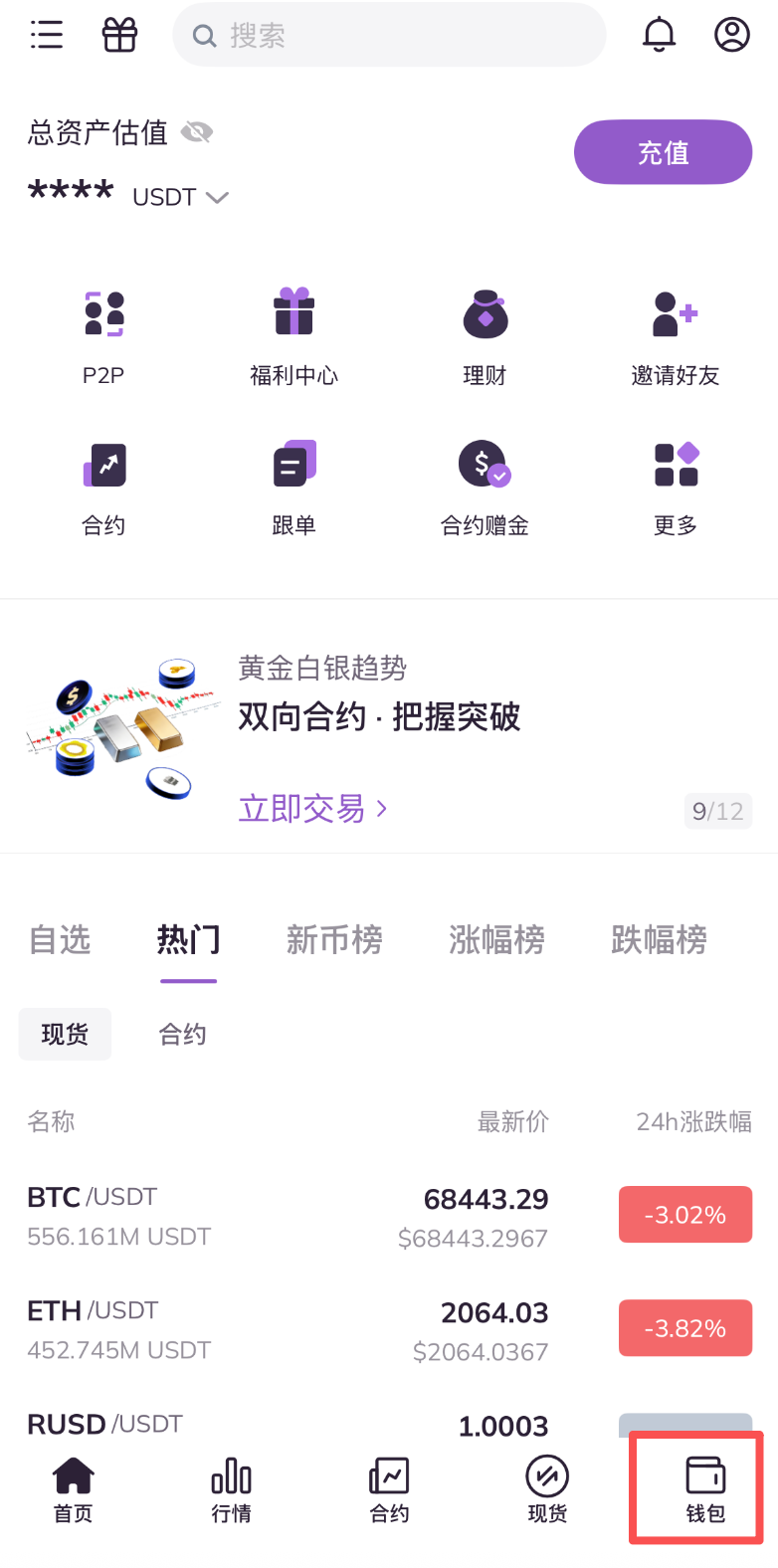 1.打开AscendEX APP,点击首页右下方钱包。