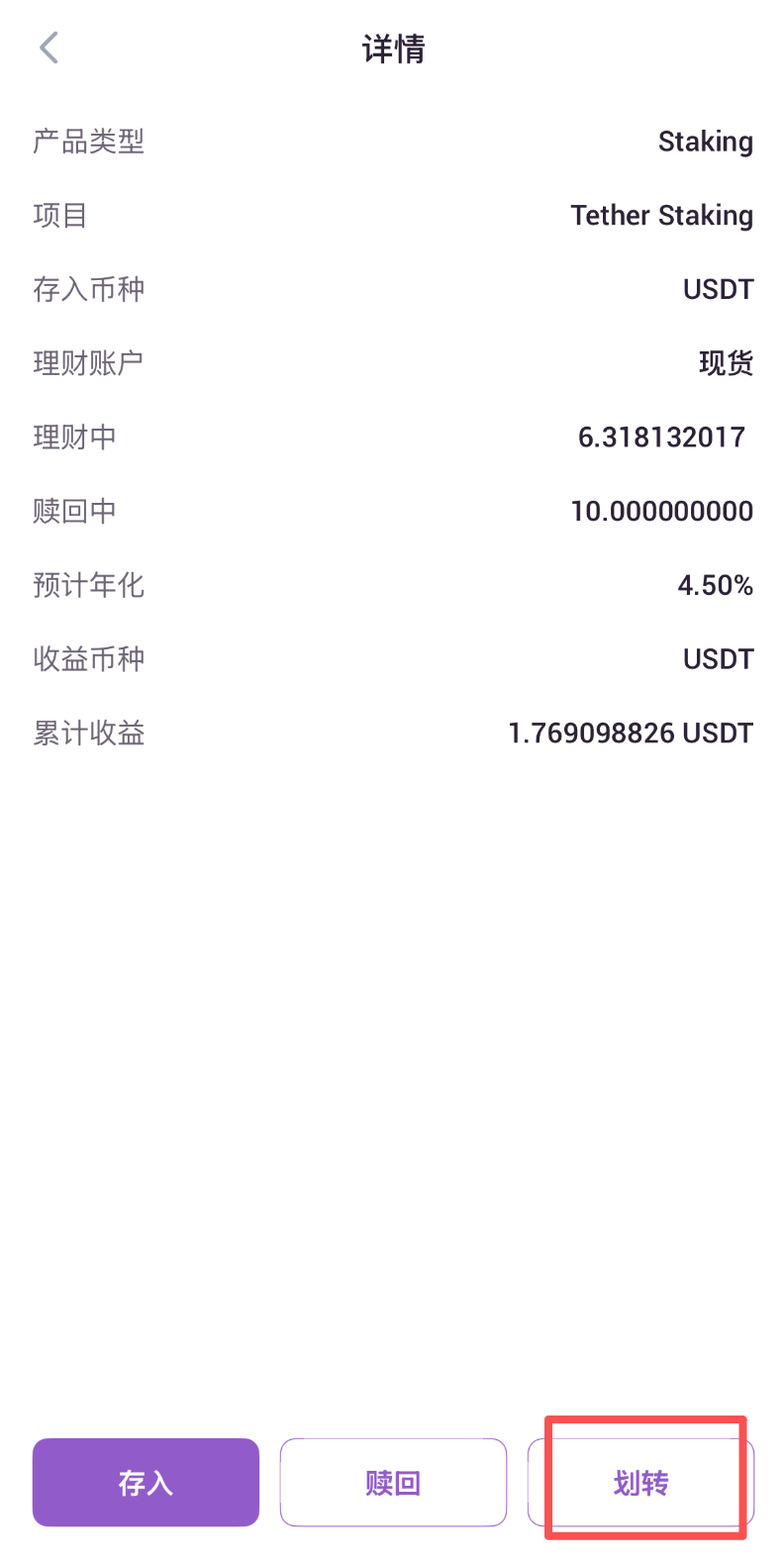 4.进入该项目理财详情页,点击页面最下端划转按钮。