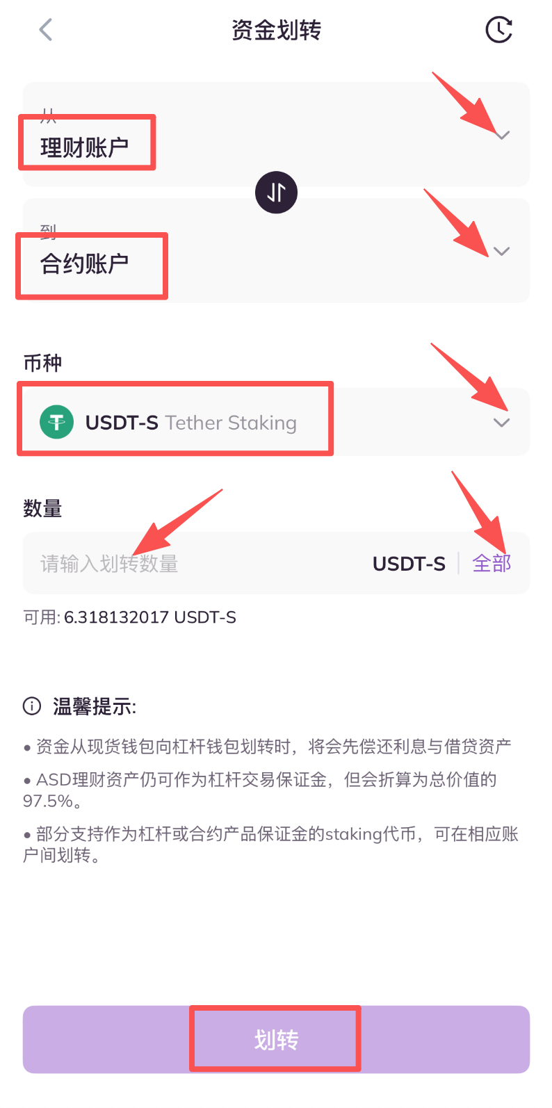 5.进入资金划转页面,划转方向选择从理财划转到合约;点击划转币种一栏右侧箭头,选择目标Staking币种(注:Staking资产会以“币种-S”形式显示在您的账户中,如BTC-S);输入币种数量,您也可以参考划转数量栏下方当前币种可用数量,点击右侧全部,实现一键划转当前所有币种。最后点击立即划转按钮,即可完成划转。