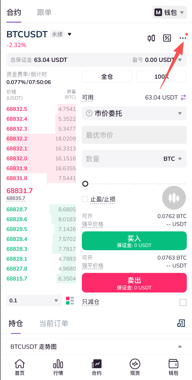 2.进入合约交易页面,点击页面右上方更多图标“···”。