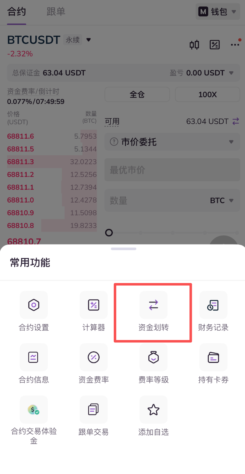若您已开通合约账户参与合约交易,您可以任意参照以下两种方式进行资金划转;若您首次参与合约交易,请参照第二种方式,即从合约交易界面进行资金划转。
