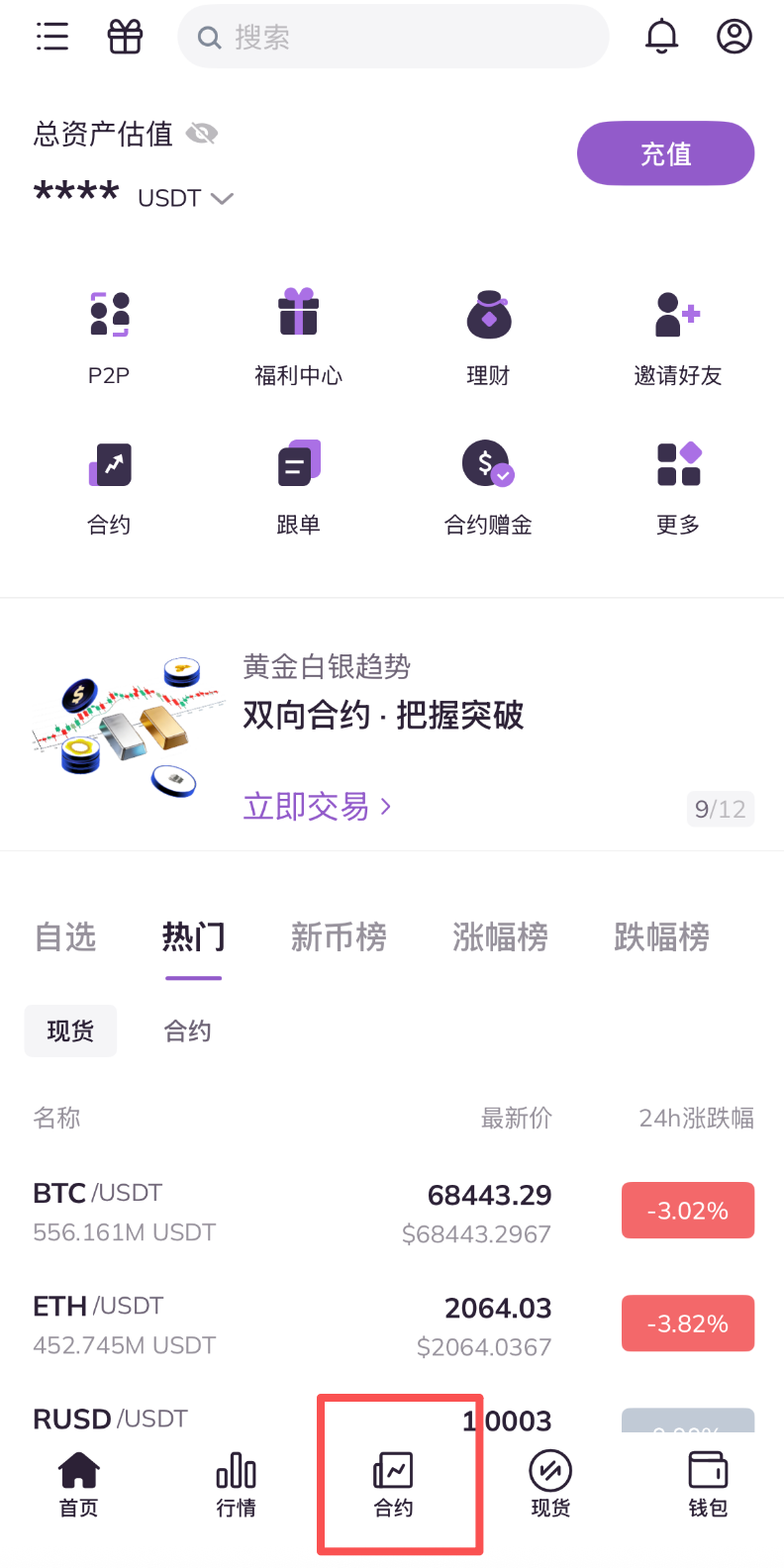 1.打开AscendEX APP,点击首页底部合约。