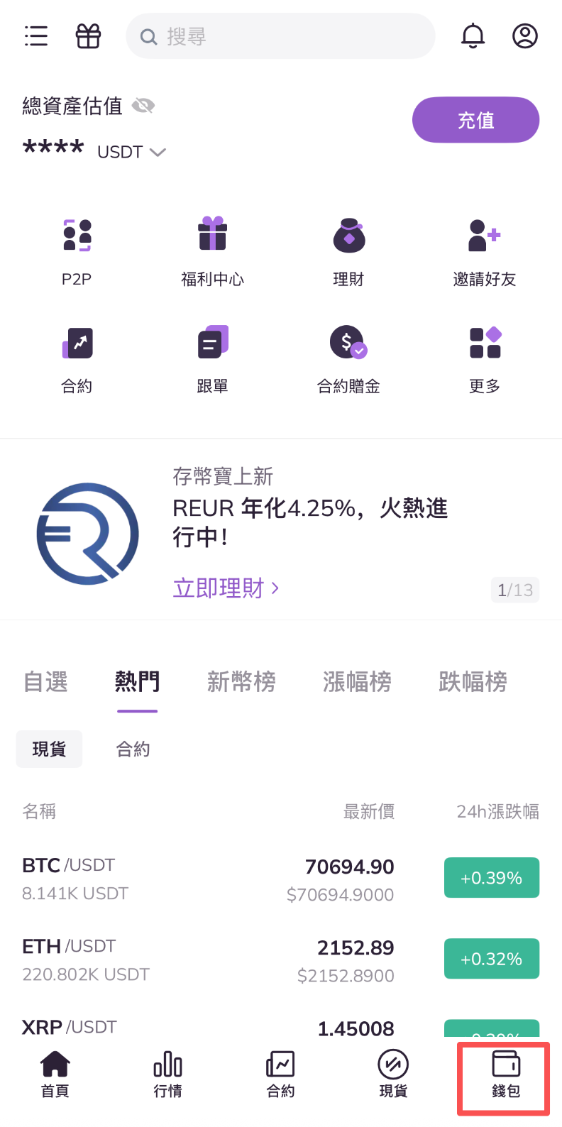 1.打開AscendEX APP,點擊首頁右下方錢包。