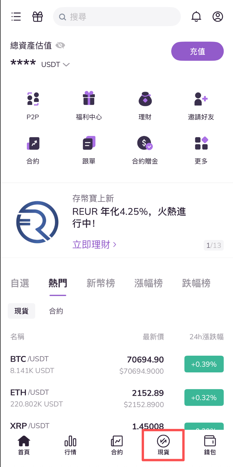 1.打開AscendEX APP,點擊首頁底部現貨。