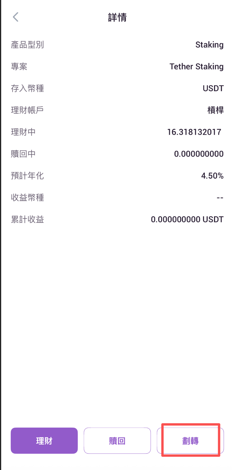 4.進入該項目理財詳情頁,點擊頁面最下端劃轉按鈕。