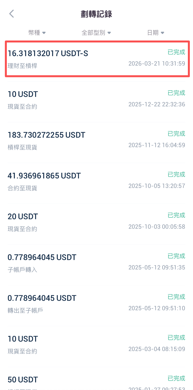 5.進入資金劃轉頁面,劃轉方向選擇從理財劃轉到槓桿;點擊劃轉幣種一欄右側箭頭,選擇目標Staking幣種(注:Staking資產會以“幣種-S”形式顯示在您的賬戶中,如BTC-S);輸入幣種數量,您也可以參考劃轉數量欄下方當前幣種可用數量,點擊右側全部,實現一鍵劃轉當前所有幣種。最後點擊立即劃轉按鈕,即可完成劃轉。