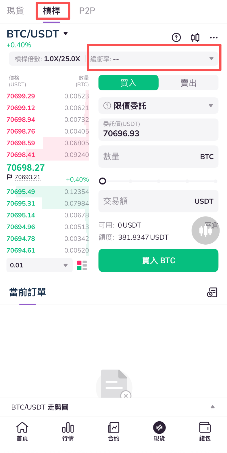 2.進入交易頁面,點擊頁面頂端槓桿交易。隨後點擊頁面上端緩衝率一欄右側下拉箭頭。