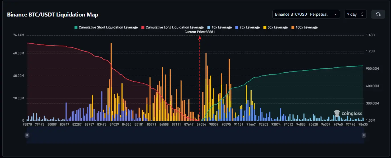 - 清算磁铁 ($85,000): 在 $85,000 一线,堆积了大量的多头清算单。这就像一块磁铁,吸引价格向下测试。做市商有动力推动价格触及这一区域以获取流动性。如果跌破 $85,000,可能会引发连环爆仓(Liquidation Cascade),将价格瞬间带至 $80,000 甚至更低。